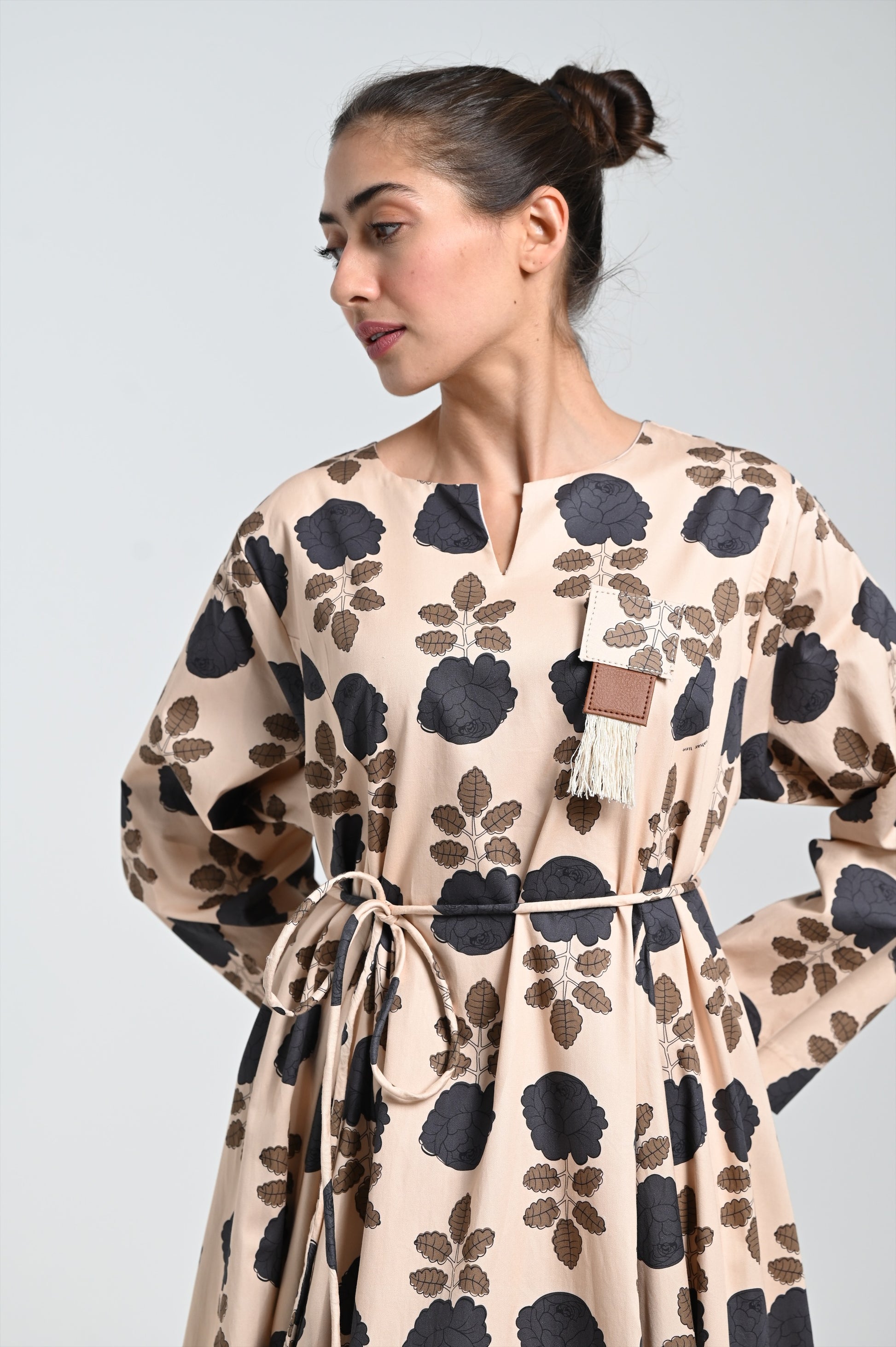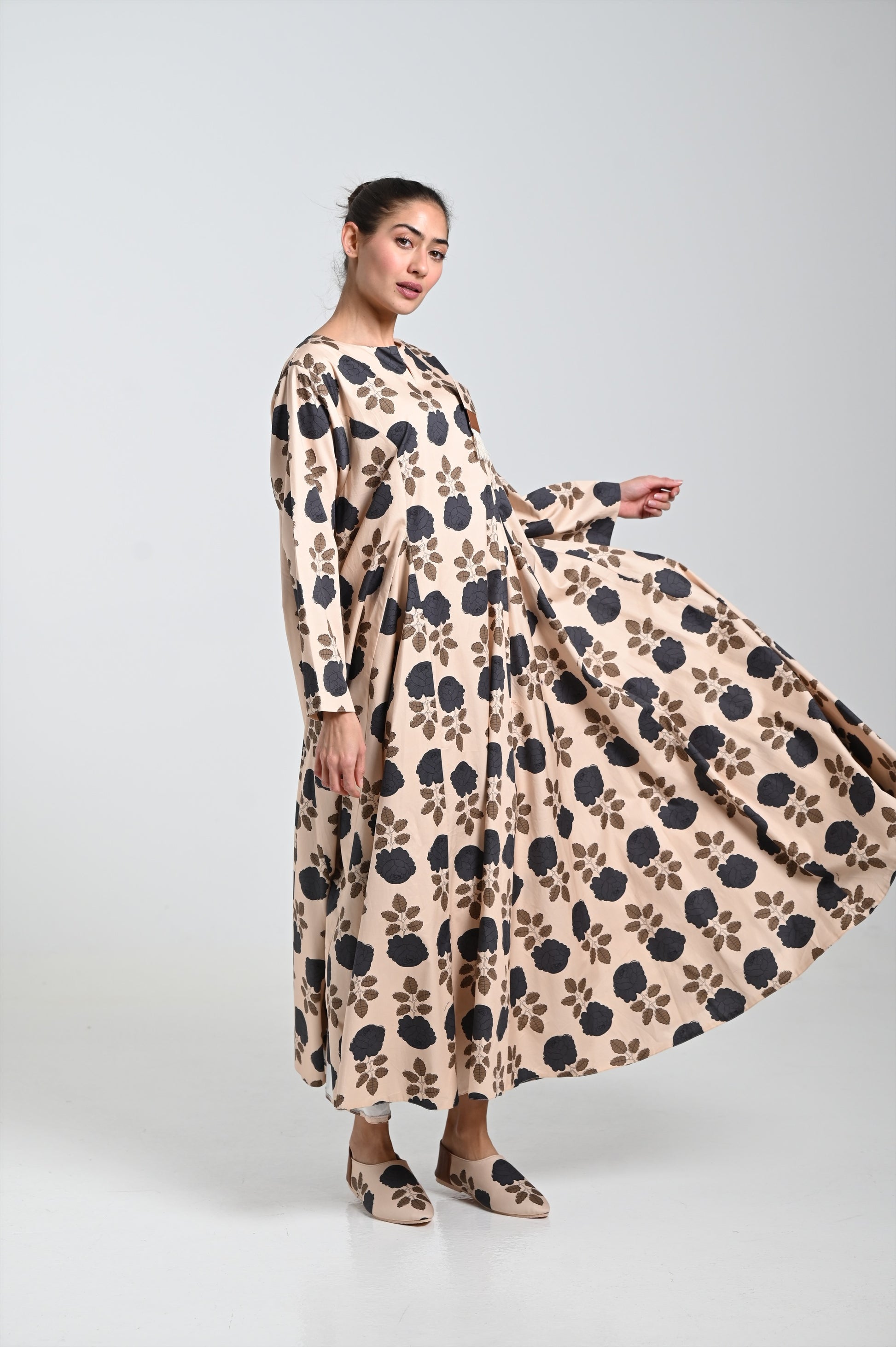 - اللون: بيج مع نقشة أزهار بالأسود والبني