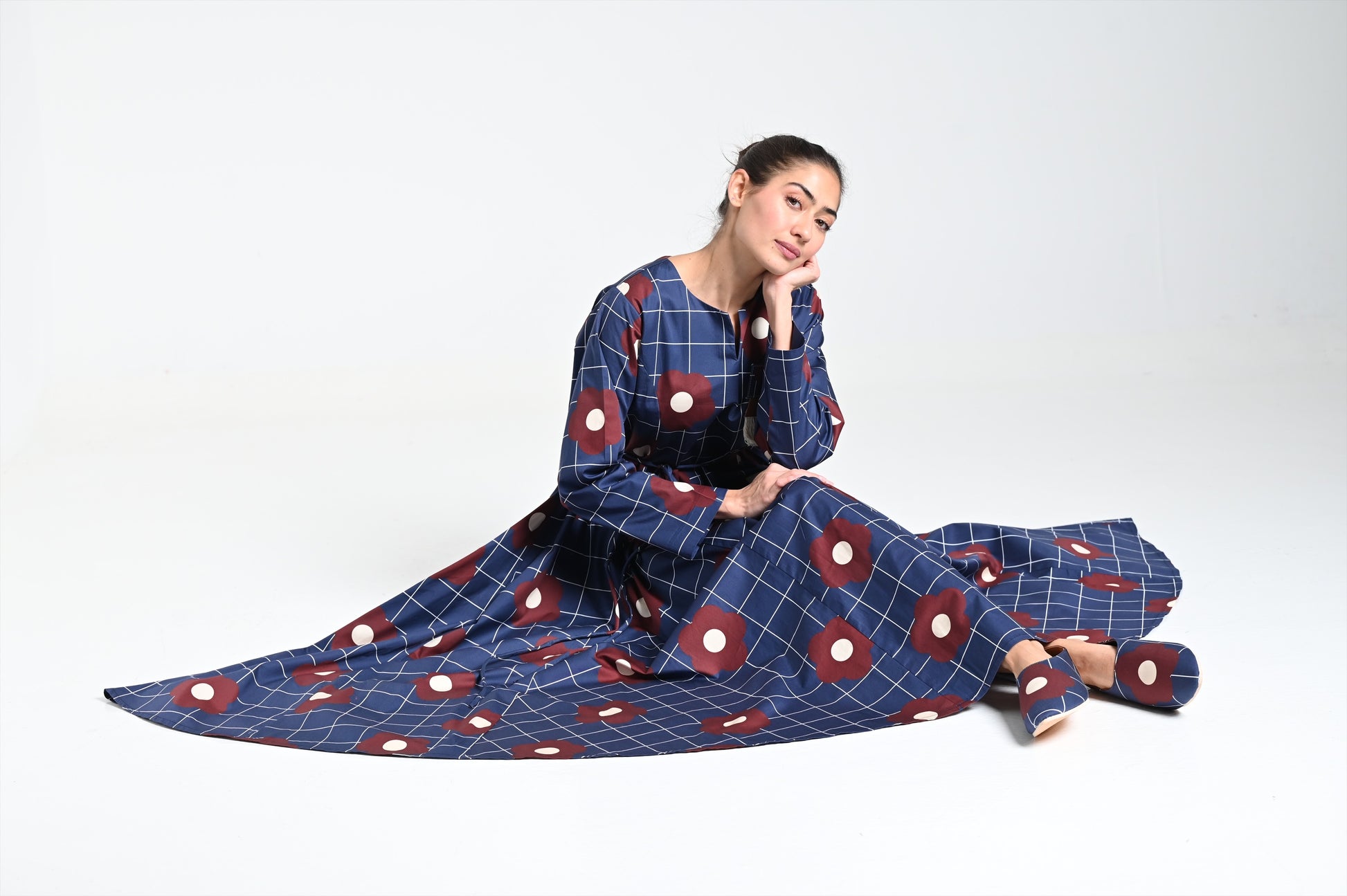 فستان كحلي بطبعة وردة عنابية مع دبوس جلدي