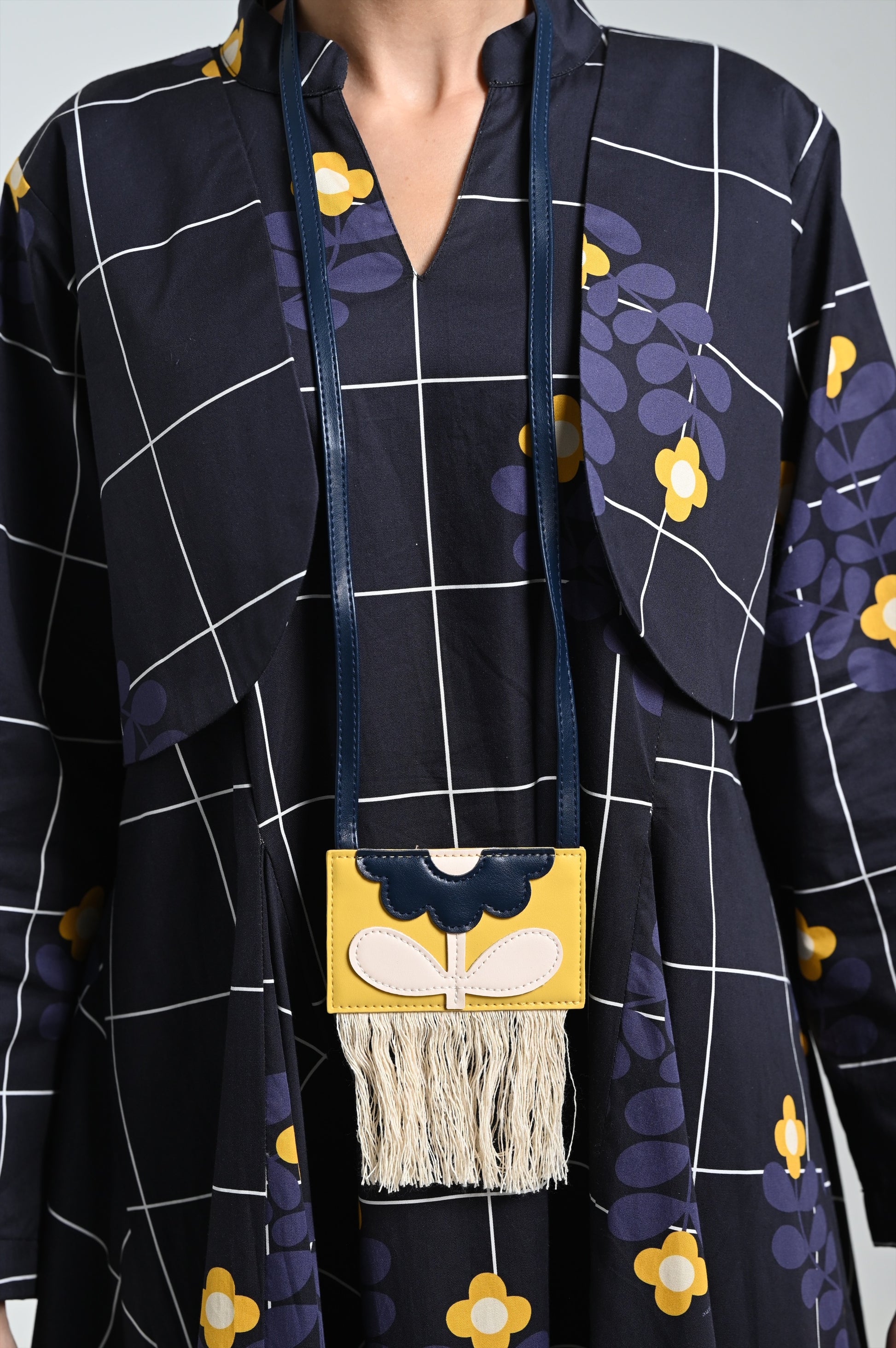 • الألوان:مصنوعة من الجلد الصناعي تجمع بين الأصفر الخردليوالكحليمع تفاصيل بيضاء كريميةوخيوط منسلة عند الأسفل تضيف طابعاً فريداً.