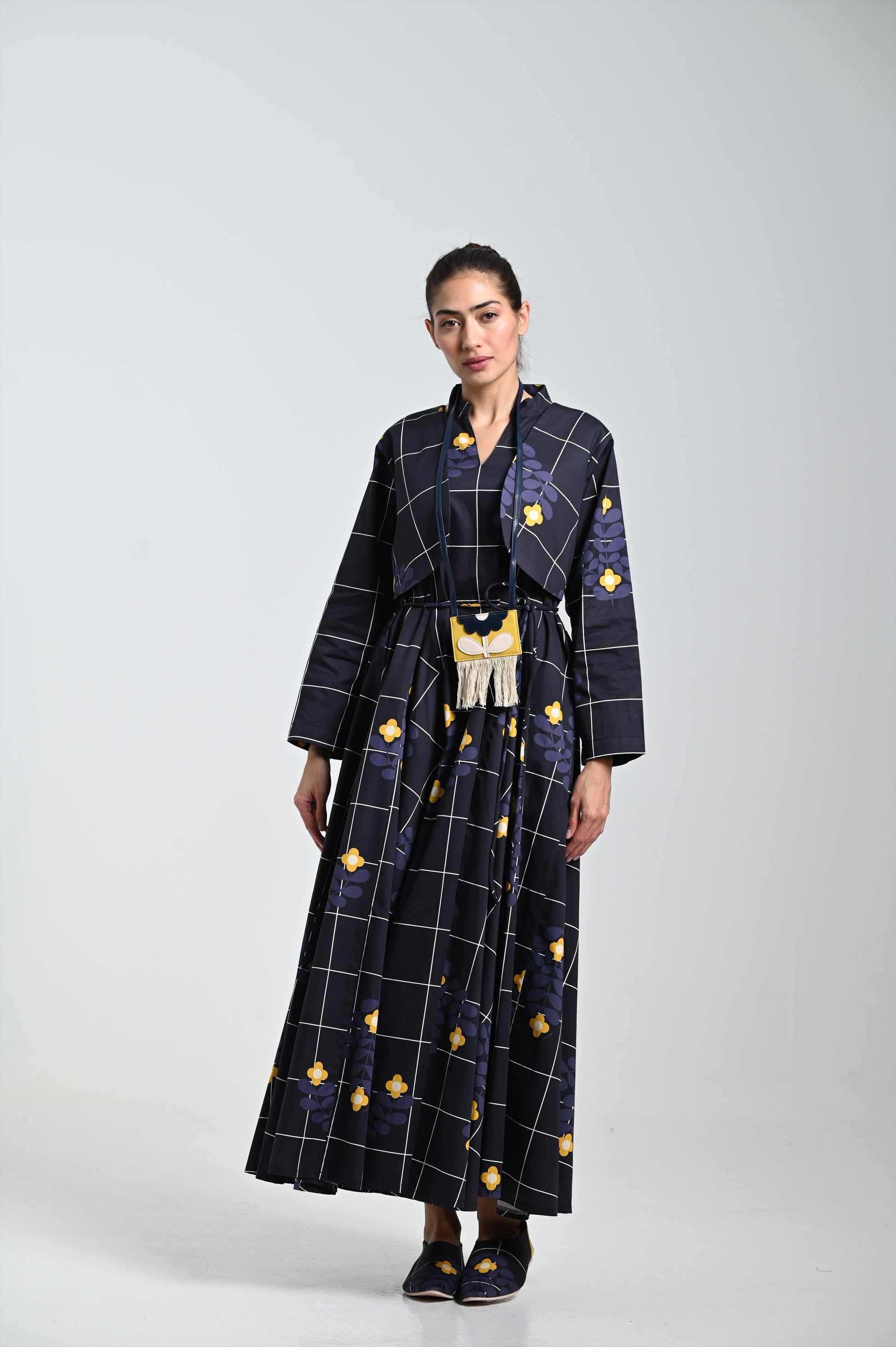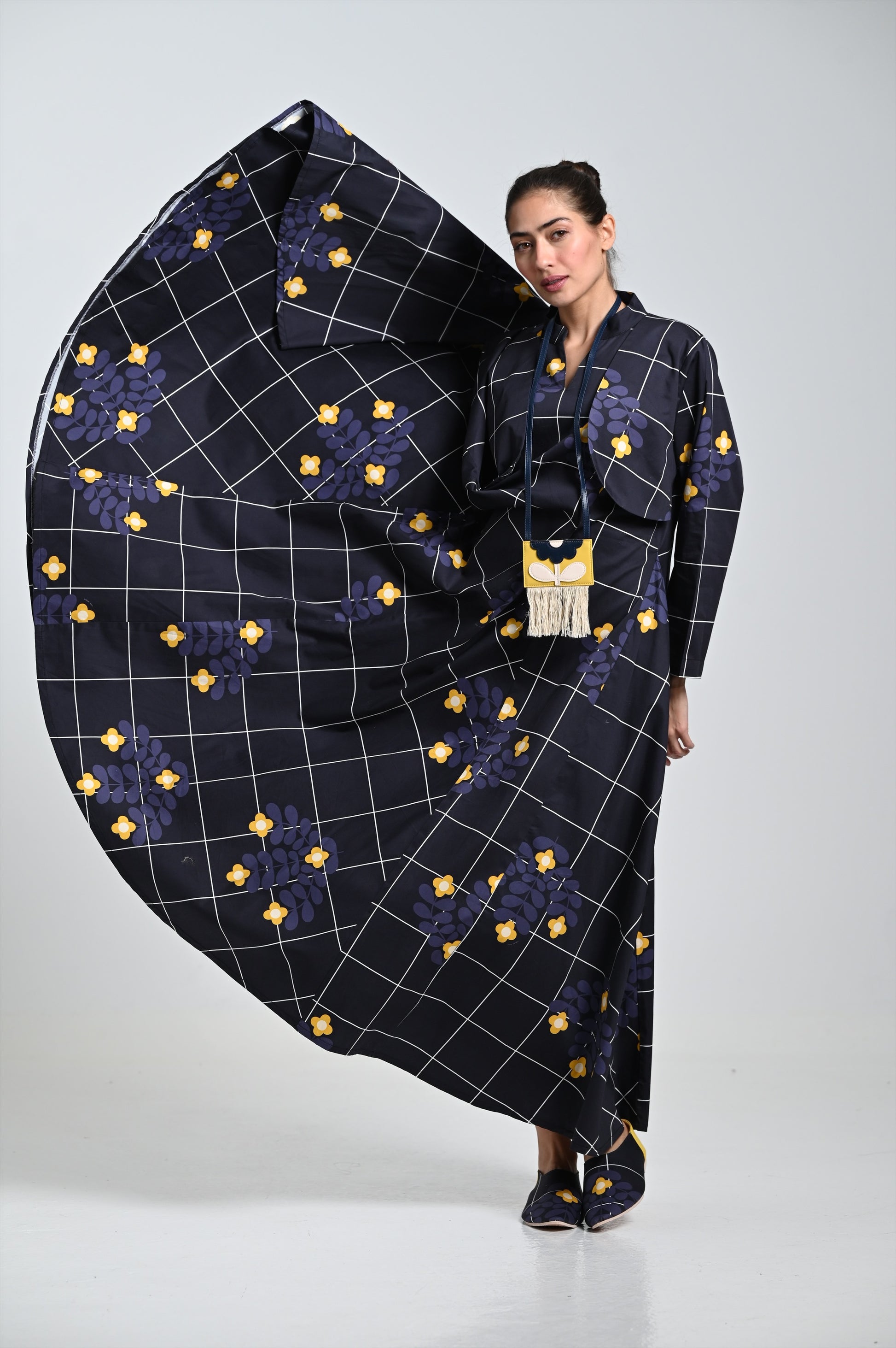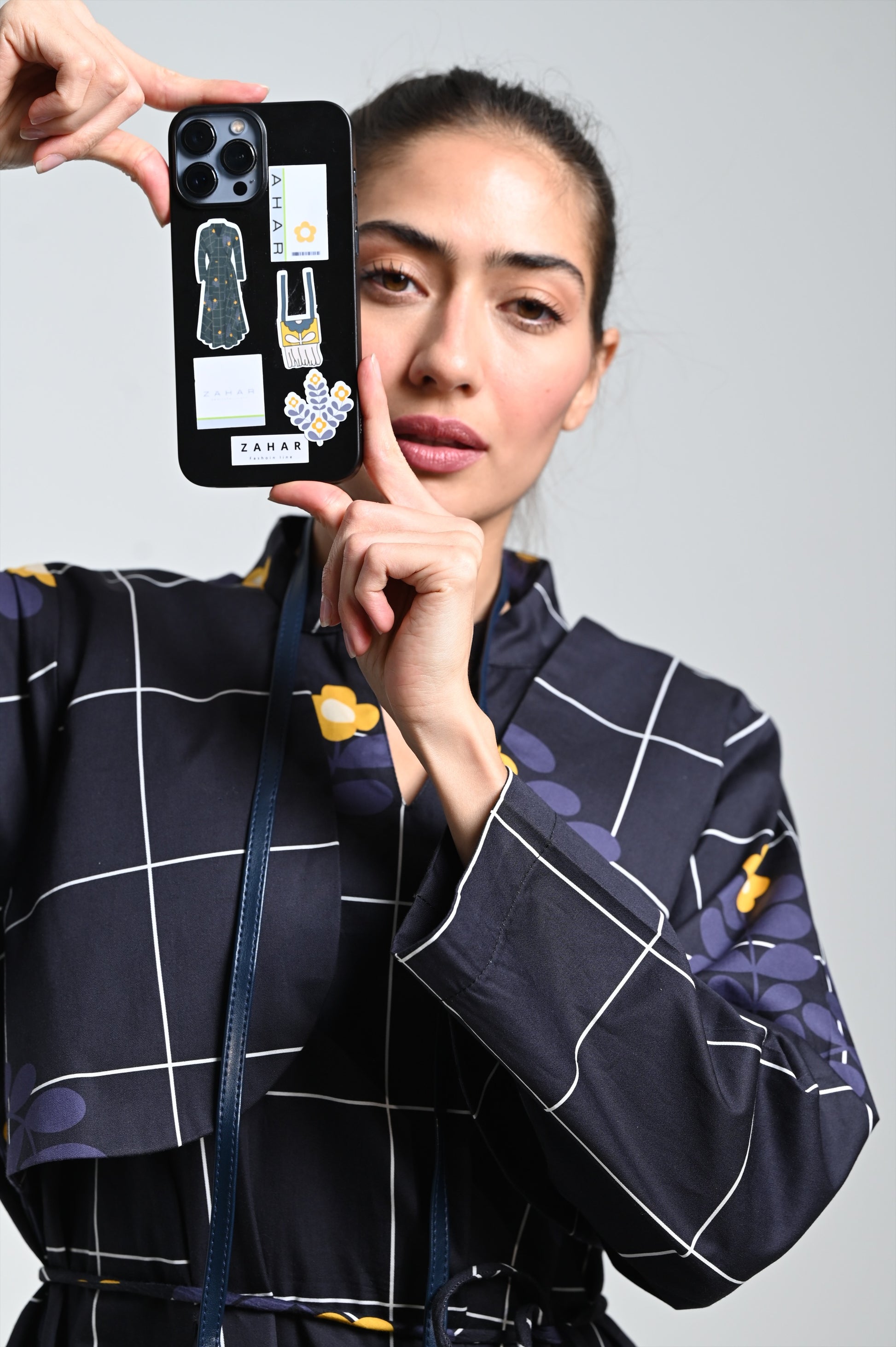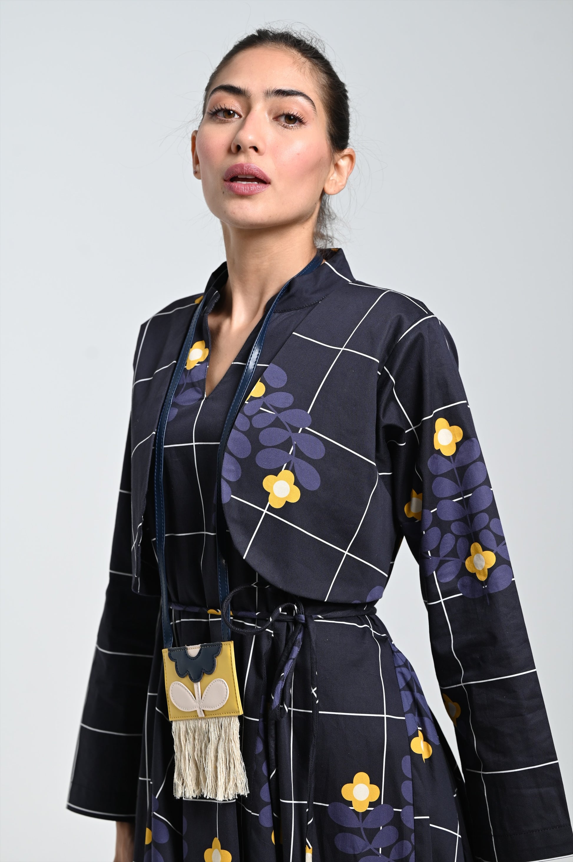 • اللون الأساسي:أزرق داكن مع نقشة خطوط مربعة ناعمة باللون العاجي.